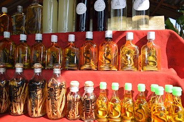Negdje na pola puta za t(h)amo, vaš će se brodić zaustaviti u selu Ban Xang Hai, gdje će vas lokalno stanovništvo upoznati, među ostalim, i s alkoholnim pićem koji se turistima predstavlja kao viski od (ljepljive) riže Lao-Lao – prva riječ u nazivu označava da se radi o alkoholu, a drugi „lao“ znači „laoski“. U ovom selu se prodaje u bočicama u koje su umetnute zmijice ili škorpioni, navodno kako bi špirit imao (još) više duha, a možda i kako bi bio zanimljiviji potencijalnim kupcima. Pa tko voli, nek' izvoli. Cijena jedne bočice je samo nekoliko tisuća kipova (ne govorim o Buddhinim kipovima, već o valuti u Laosu).